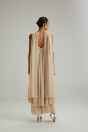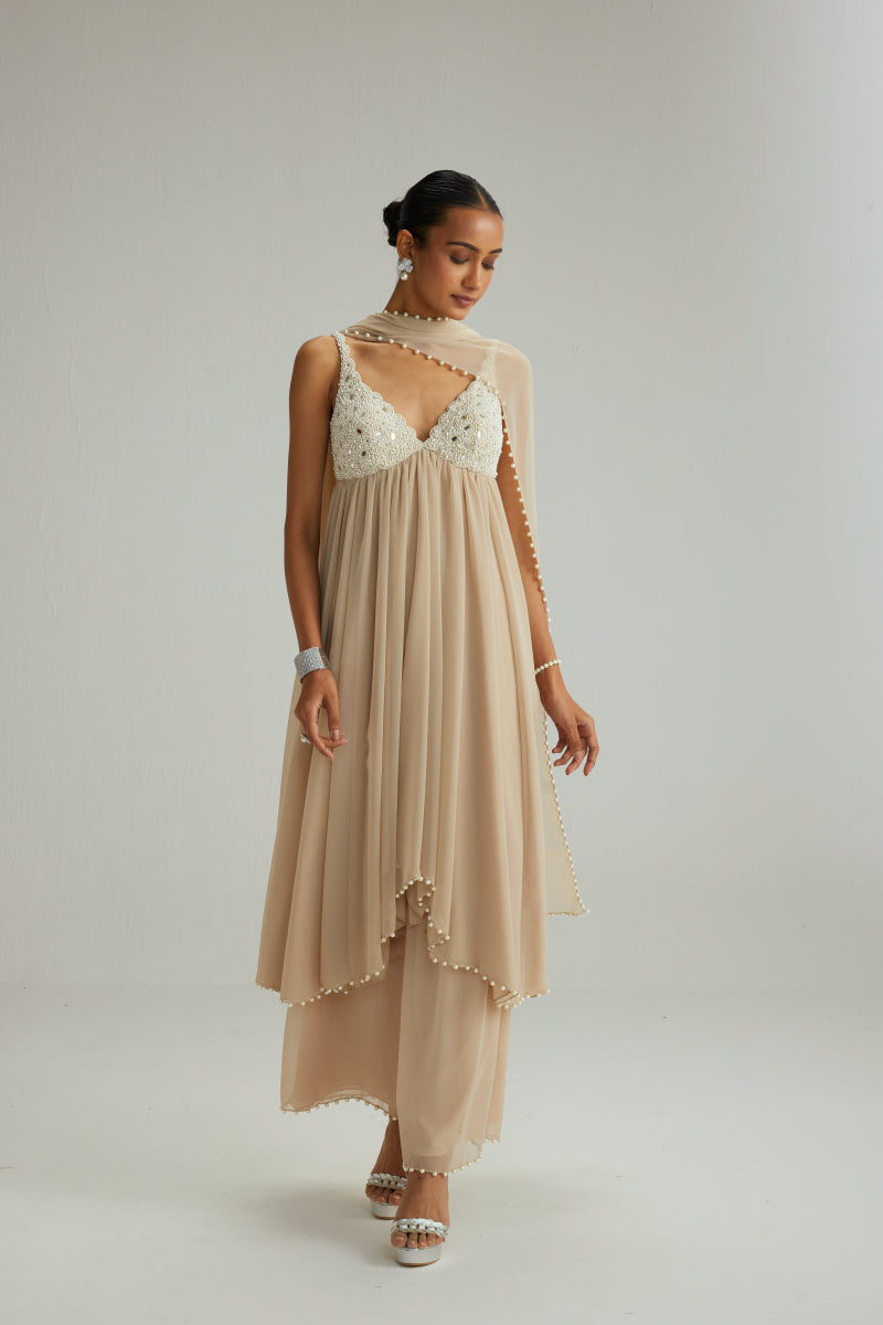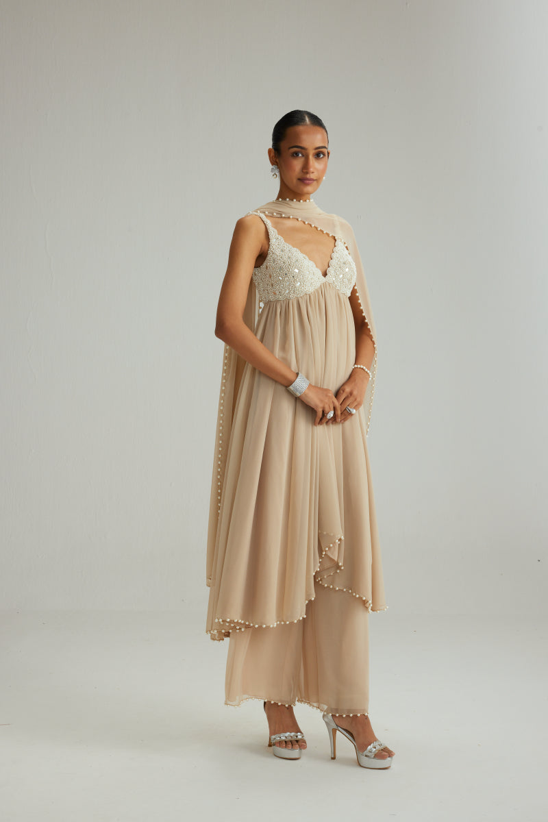 Light beige mirror and pearl embroidered kurta paired with georgette pants and dupatta set.