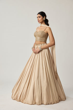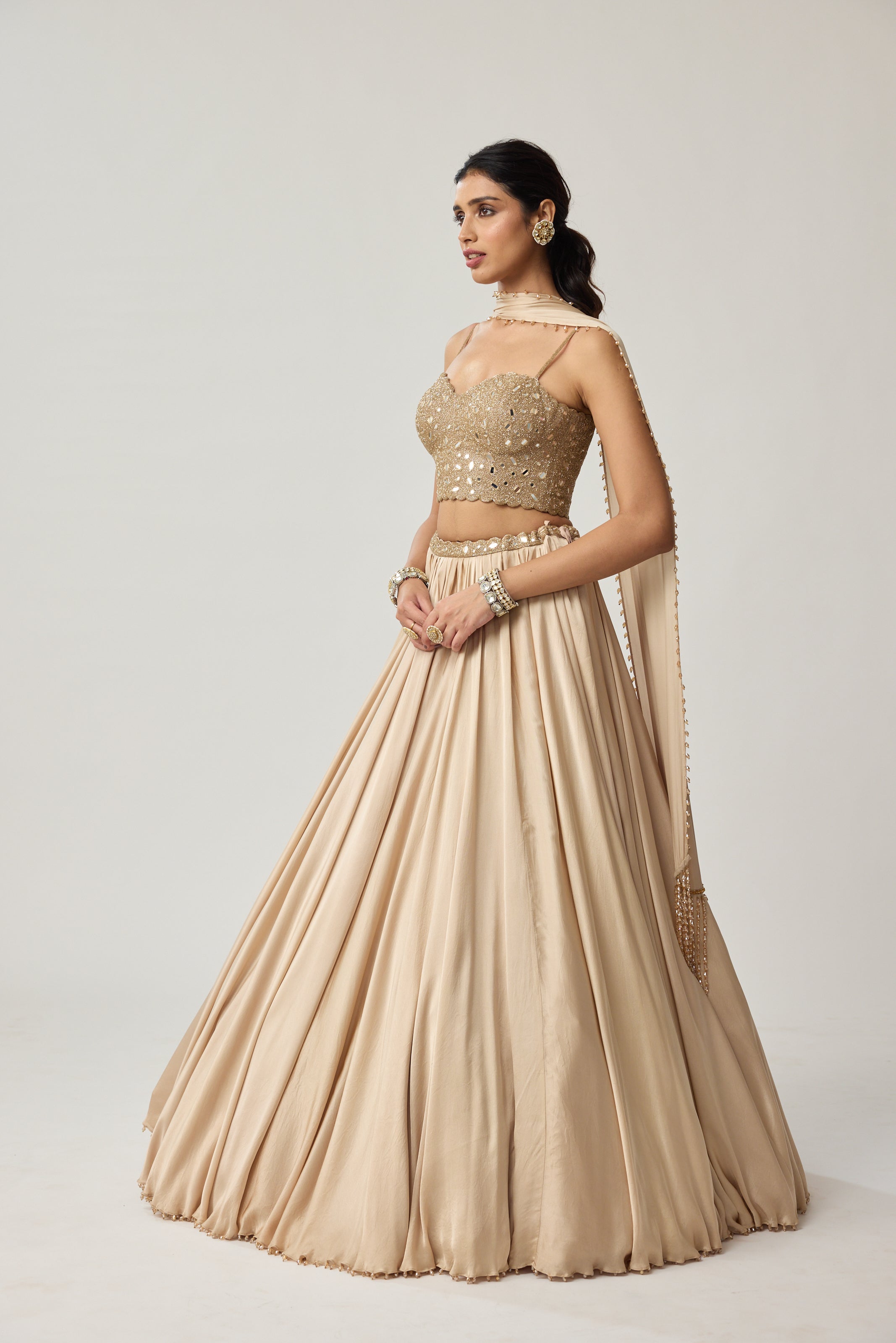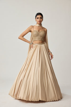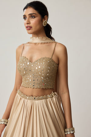 Light Beige Satin skirt paired with a heavily Mirror embroidered halter neck blouse and Stole