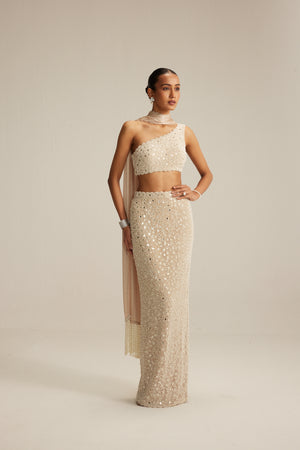 Light Beige One Shoulder Pencil Skirt With Stole Set
