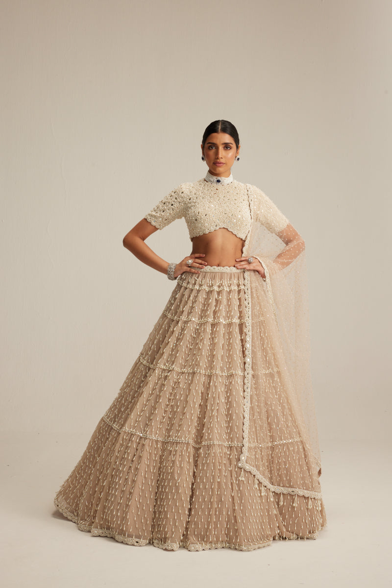Light Beige Pearl Drop Multi Tier Lehenga With High Neck Blouse Set.