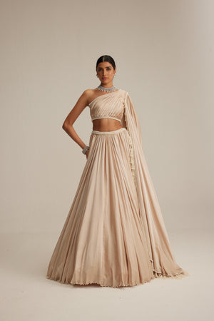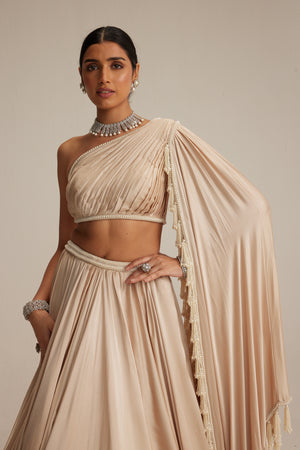 Light beige satin lehenga paired with draped satin blouse with attached tassel trail. DISCLAIMER :- The colour might slightly vary from the images