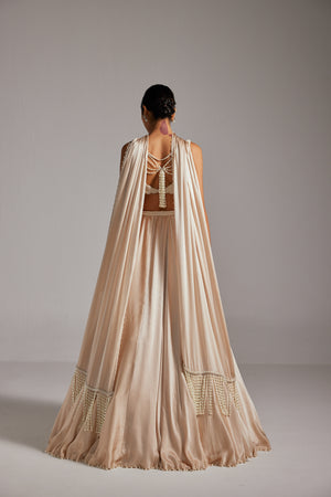 Light beige Satin skirt paired with a heavily embroidered V neck blouse and Stole.