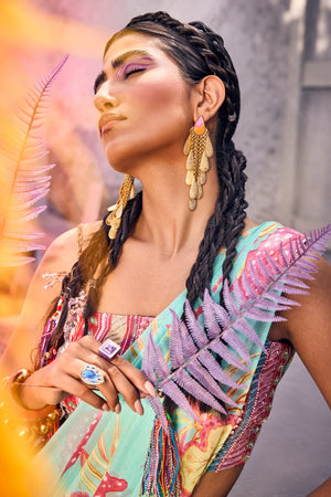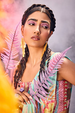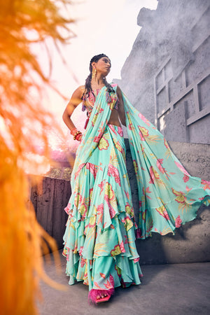 Indulge in the opulence of our Ruffle Style Saree, our lavish Paudha Collection. The set features a beautiful blend of pastel hues with eye-catching floral motifs. The outfit has been crafted from the finest quality fabrics, boasting a light and airy feel that's ideal for any occasion.