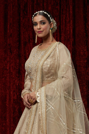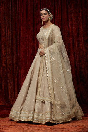 Featuring This Light Gold Cotton Chanderi Lahenga With Fine Gota Work. It'S Paired With Embroided Chanderi Blouse And Net Dupatta.
