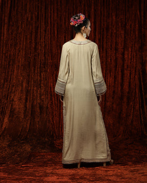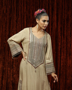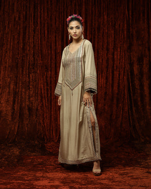 Featuring a Light Gold, Maroon & Mehandi Green Kurta kaftan in Silk Chanderi and with fine gota, dori, badla work.