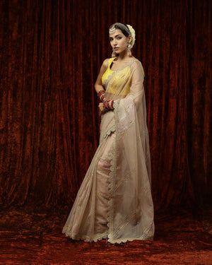 Thes is a beautiful Light Gold Pink & Yellow organza saree with exquisite detailing of Badla and Kasab work and Hyderabadi micro pearls. This saree is paired with a Yellow blouse with rose gold gota, pearl and crystal drop detailing. This blouse beautifully complements the saree providing the outfit a classic look!