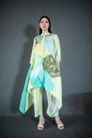 A two piece dupion silk set comprised of abstract geometric and floral print in playful color compositions and parallel pants with fusion textiles.