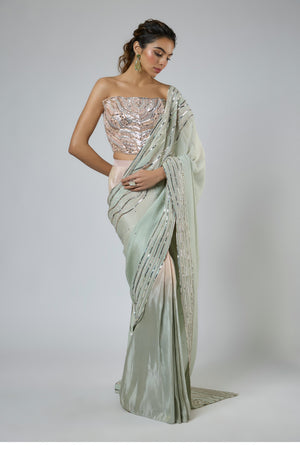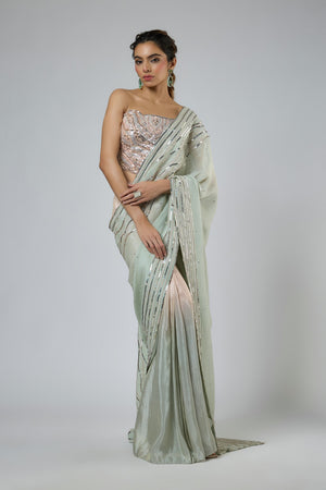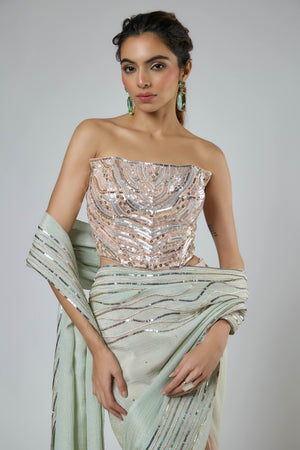 An ombré masterpiece blending mint and pink hues, accentuated with exquisite embroidery. Styled with a structured Mashroo silk corset, this look is a statement in modern-day couture.