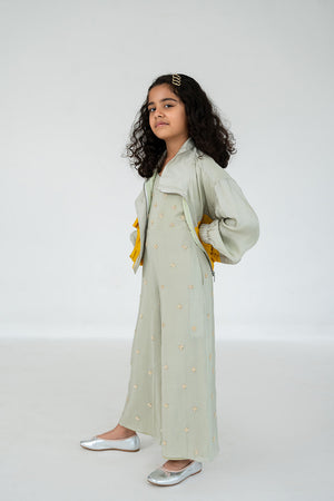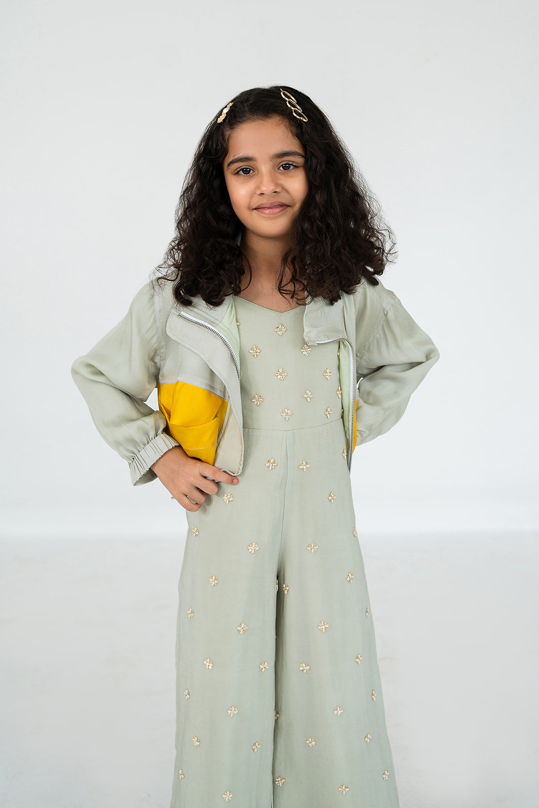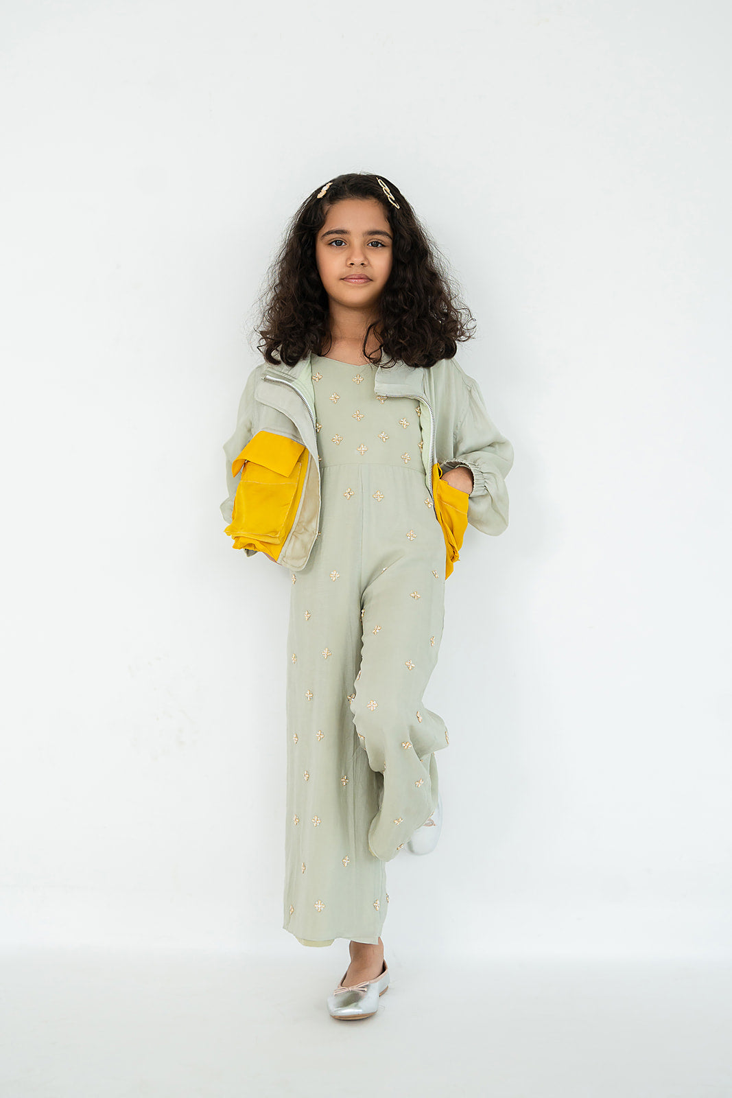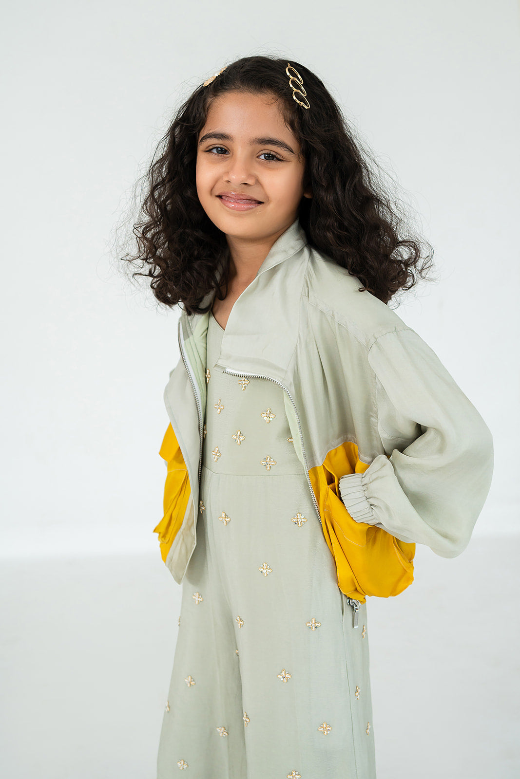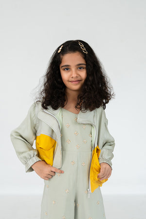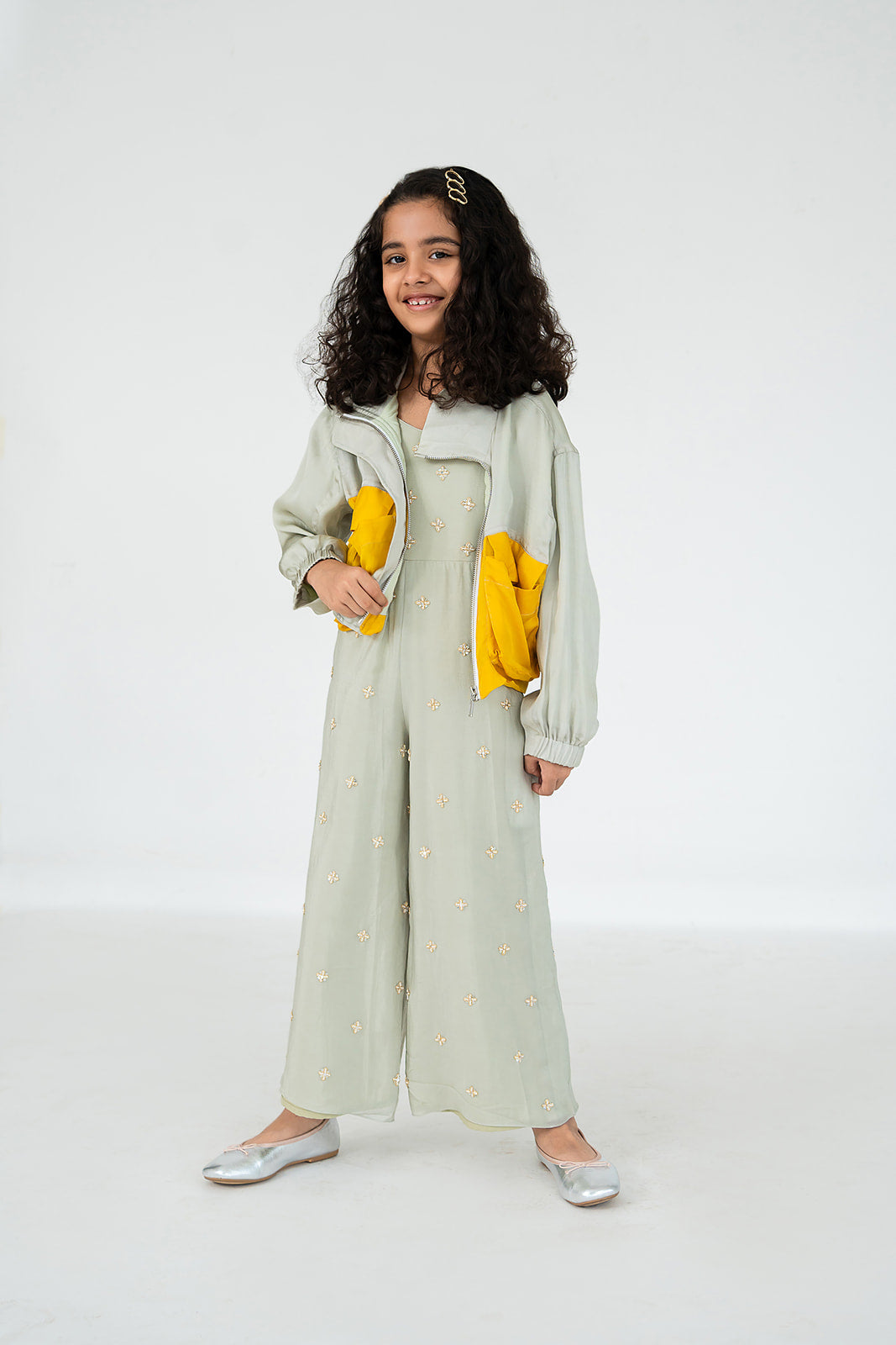 LIGHT MINT BLUE BUTTI EMBROIDERED JUMPSUIT PAIRED WITH A BOMBER JACKET WITH YELLOW PATCH POCKETS