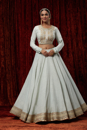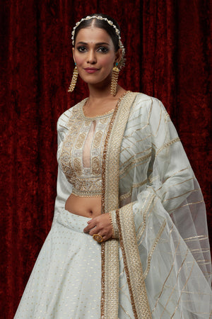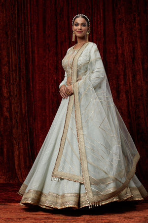 Featuring This Light Sky Blue Cotton Chanderi Lehenga With Fine Gota Work. It's Paired With Embroided Chanderi Blouse And Net Dupatta.