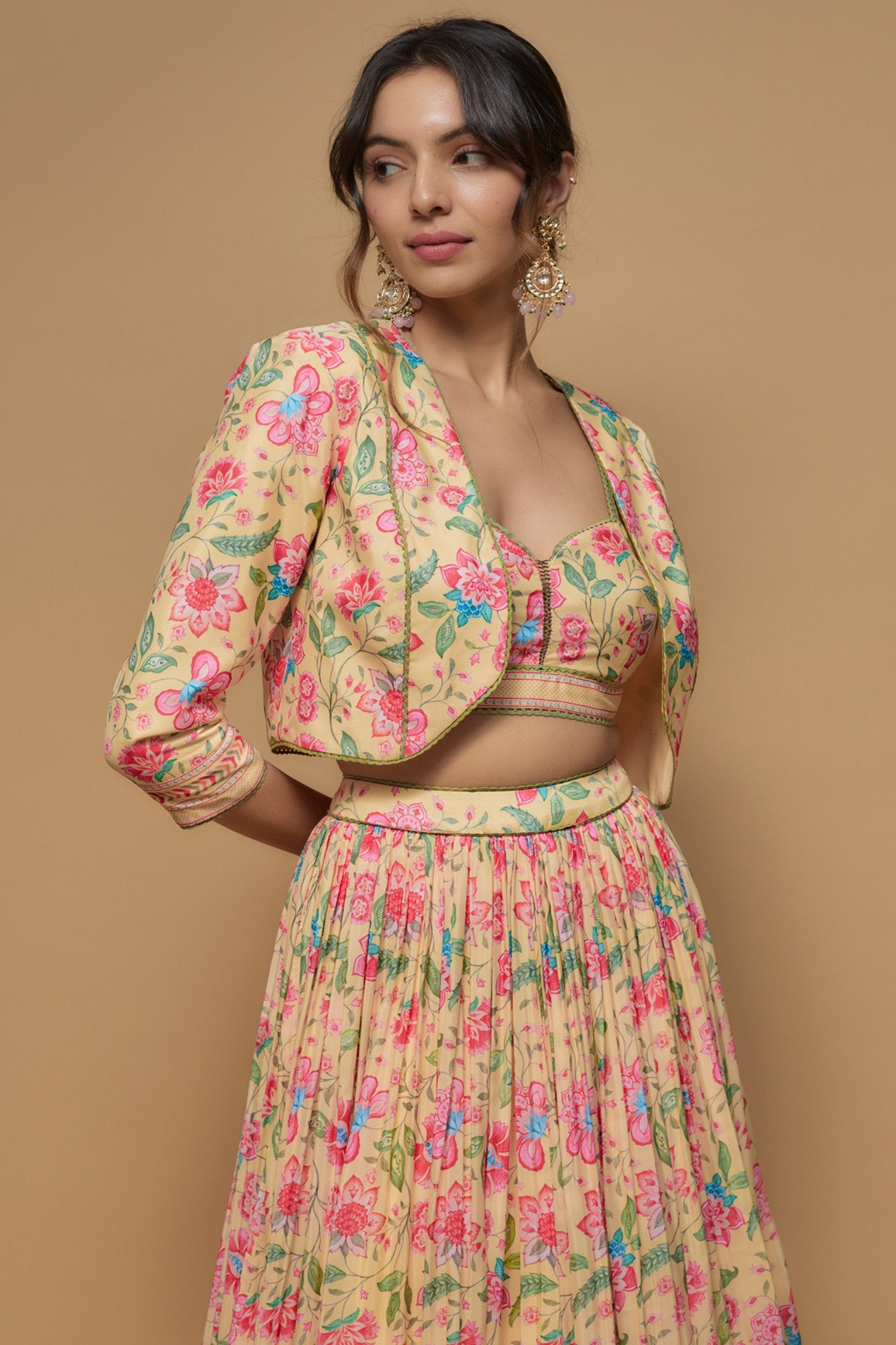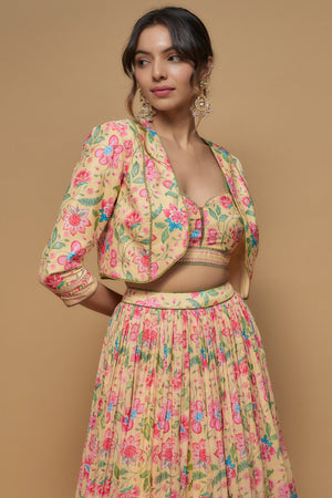 Featuring a light yellow lehenga in french crepe base with floral print. It is paired with a matching bralette having lace detail and a jacket.