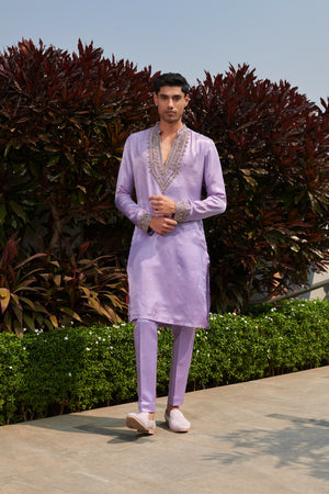 This outfit is a stylish and elegant traditional ensemble, consisting of a kurta and pant, designed for festive and formal occasions. The kurta is crafted from a luxurious, lavender silk fabric with a subtle sheen, giving it a regal and sophisticated appeal. It features intricate silver embroidery along the deep V-shaped neckline and cuffs, adding a touch of grandeur and elegance. The full-length sleeves and straight-cut silhouette ensure a refined yet comfortable fit.