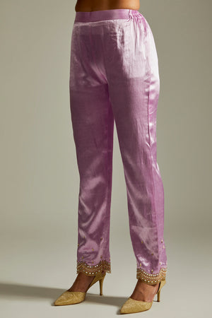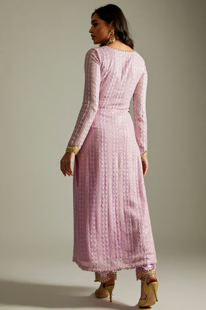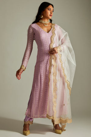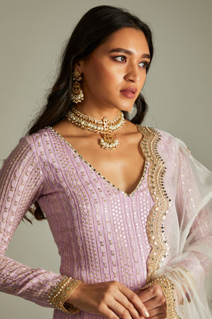 This Look Features Lilac Kurta Pants Set. The Full Sleeves Kurta Is Embroidered With Sequin & Thread All Over With A Mirror Embellished Scallop Border On Hemlines.It Is Teamed With Straight Fit Ankle Length Pants. A Porcelain White Organza Dupatta With Matching Scallop Border And Bootis Completes The Look.