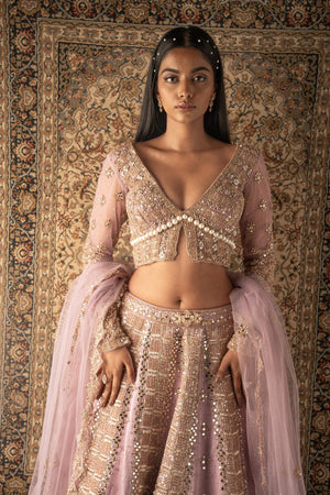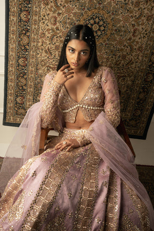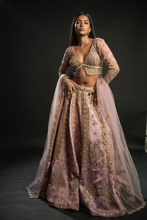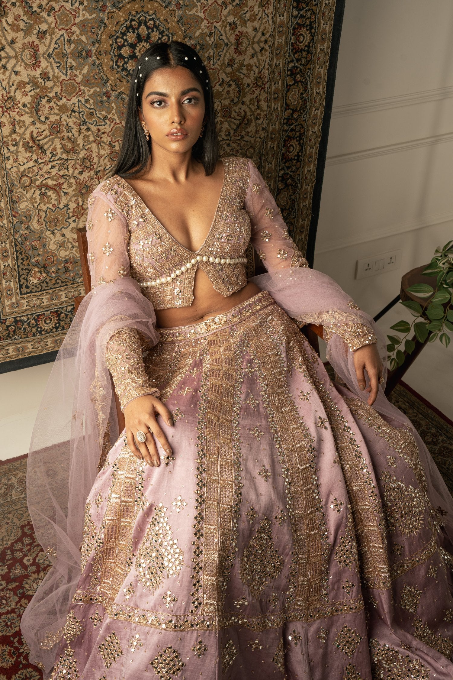 This dusty pink lehenga set exudes regal charm and sophistication, crafted from luxurious linen satin for a sumptuous feel. Paired with a delicate net blouse and dupatta, it embodies timeless elegance with a touch of ethereal grace. Perfect for a summer wedding, this ensemble is destined to be the centerpiece of any venue, captivating all with its majestic presence. Radiating regal allure, this lehenga is a statement of unparalleled beauty, fit for a queen on her special day.