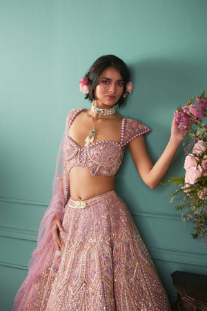 Featuring a lilac lehenga in velvet base with zardosi, french knot, and mukaish work embroidery. It is paired with a corset style blouse with pearl detailing and a net dupatta.