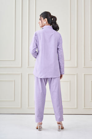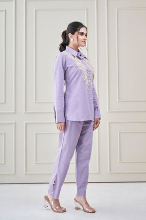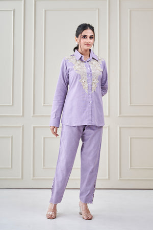An airy lilac co-ord set detailed with delicate organza 3D appliqué embroidery across the yoke. Crafted in soft cotton, it’s the perfect blend of texture, comfort, and understated elegance — ideal for festive mornings or intimate gatherings.