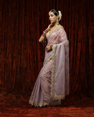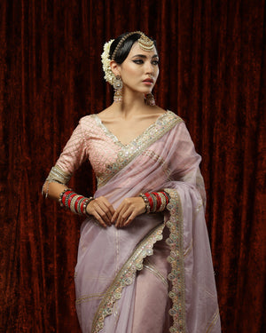 Thes is a beautiful Lilac & Pink organza saree with exquisite detailing of Badla and Kasab work and Hyderabadi micro pearls. This saree is paired with a Pink blouse with rose gold gota, pearl and crystal drop detailing. This blouse beautifully complements the saree providing the outfit a classic look!