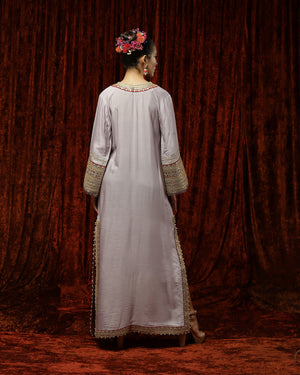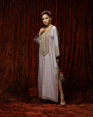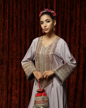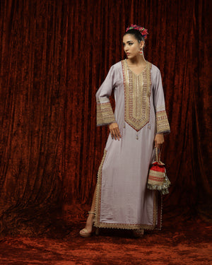 Featuring a Lilack & Maroon Kurta kaftan in Silk Chanderi and with fine gota, dori, badla work.