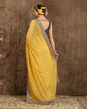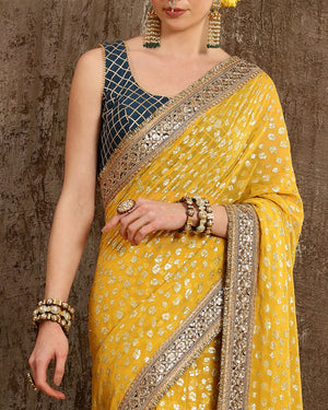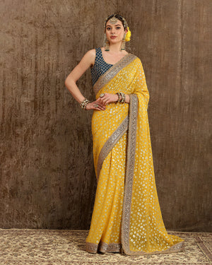This Lime yellow saree is symbolic of elegance. It is made out of Georgette fabric. There is fine detailing of Dori, Badla and Kasab work. This saree is paired with a Cobalt blue Chanderi blouse with Gota work. This blouse beautifully complements the saree providing the outfit a classic look!