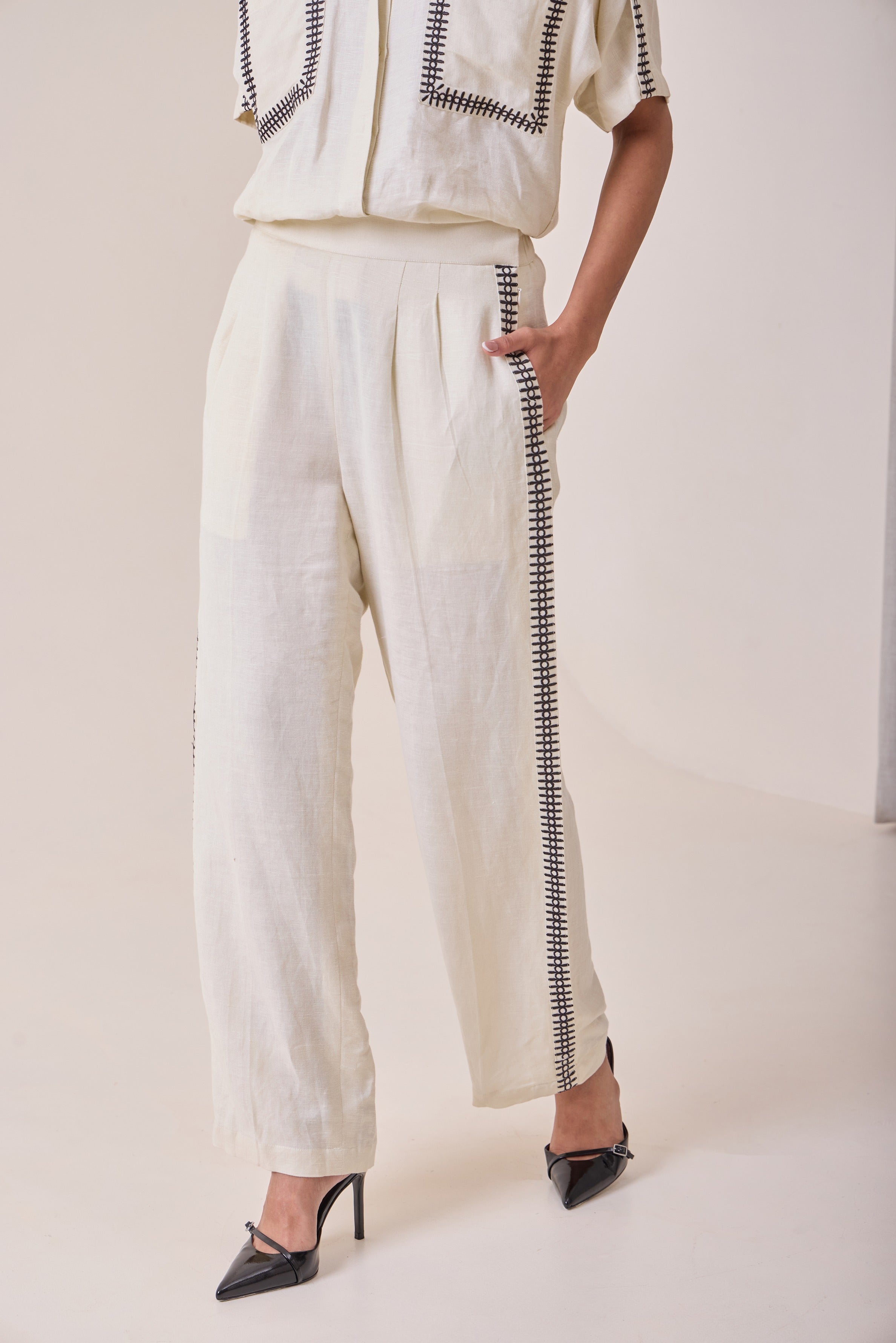 Soft beige viscose linen pants with front pleats, side pockets, and a comfortable back elastic — finished with subtle black embroidery for a touch of design without the effort. Wear them all day, travel in them, live in them. A neutral staple you’ll keep reaching for.