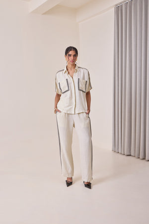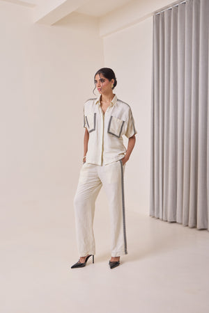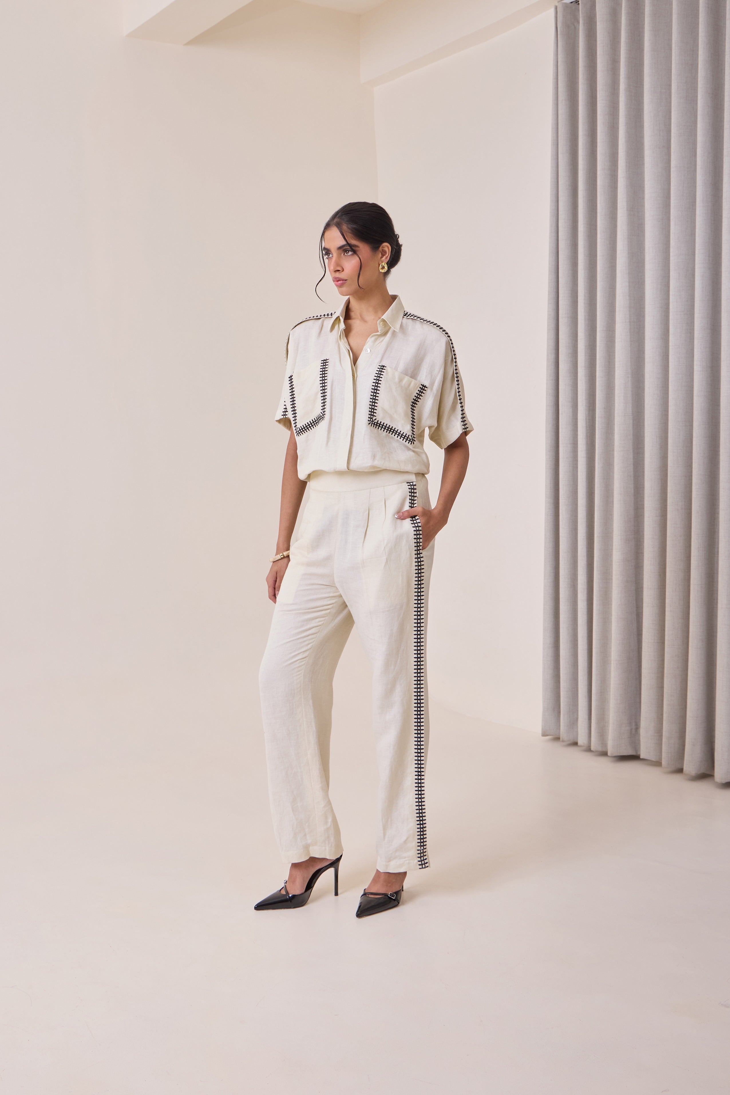 A relaxed-fit beige viscose linen shirt with two front pockets and contrast black embroidery that adds just the right amount of detail. Easy to wear, easy to style — the kind of piece that goes from coffee runs to casual dinners without trying too hard. Comfortable, understated, and ageless.