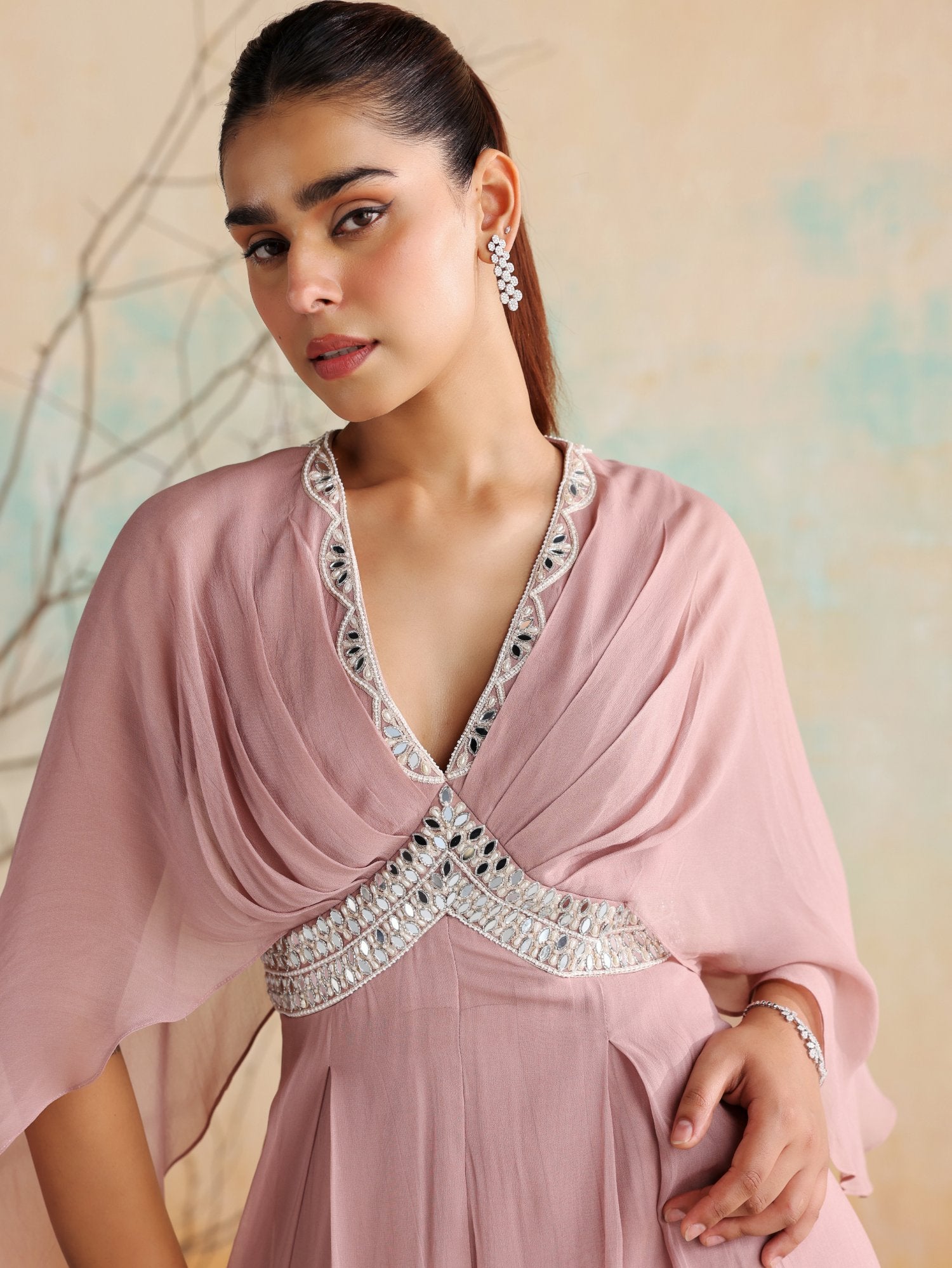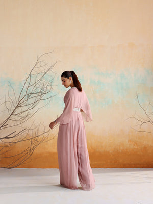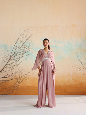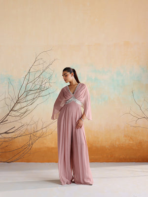 Draped Pleated Jumpsuit With An Embellished Neckline And Belt. Machine And Hand Embroidery With Resham Thread, Mirror, Glass Beads And Pearls.