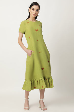 Round neck loose fit dress in grass green colour with frill panel at the botton and brown colour heart embroidery detailing all over