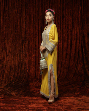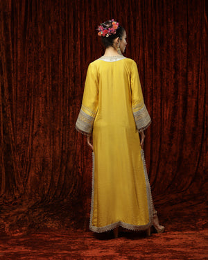 Featuring a Lomon Yellow & Gray Kurta kaftan in Silk Chanderi and with fine gota, dori, badla work.