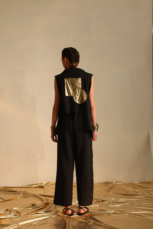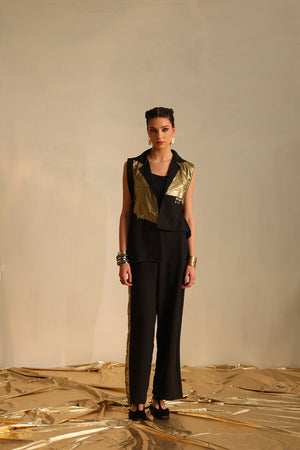 Long and short foil blazer embellished with threadwork, golden coins and hanging embroidery paired with a palazzo pant