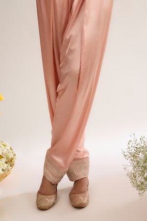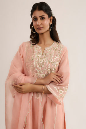 This beautiful Choga style AALIYAH is made from Chanderi fabric, it is teamed with Satin salwar and sheer embroidered oragnza dupatta. This outfit features a classic neck design and has three quater sleeves
