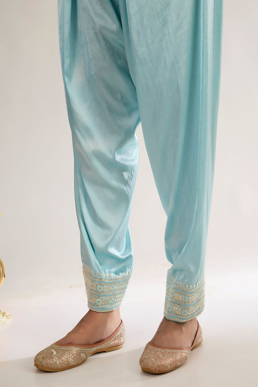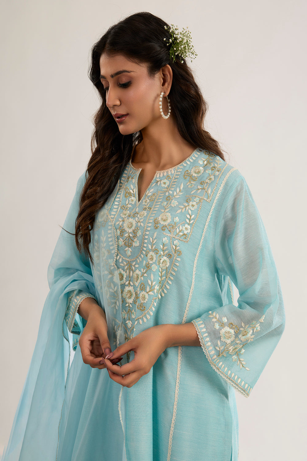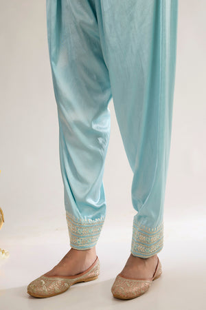 This beautiful Choga style AAMINA is made from Chanderi fabric, it is teamed with Satin salwar and sheer embroidered oragnza dupatta. This outfit features a classic neck design and has three quater sleeves