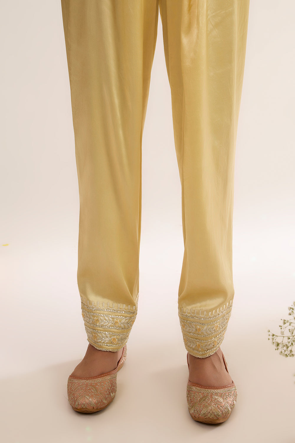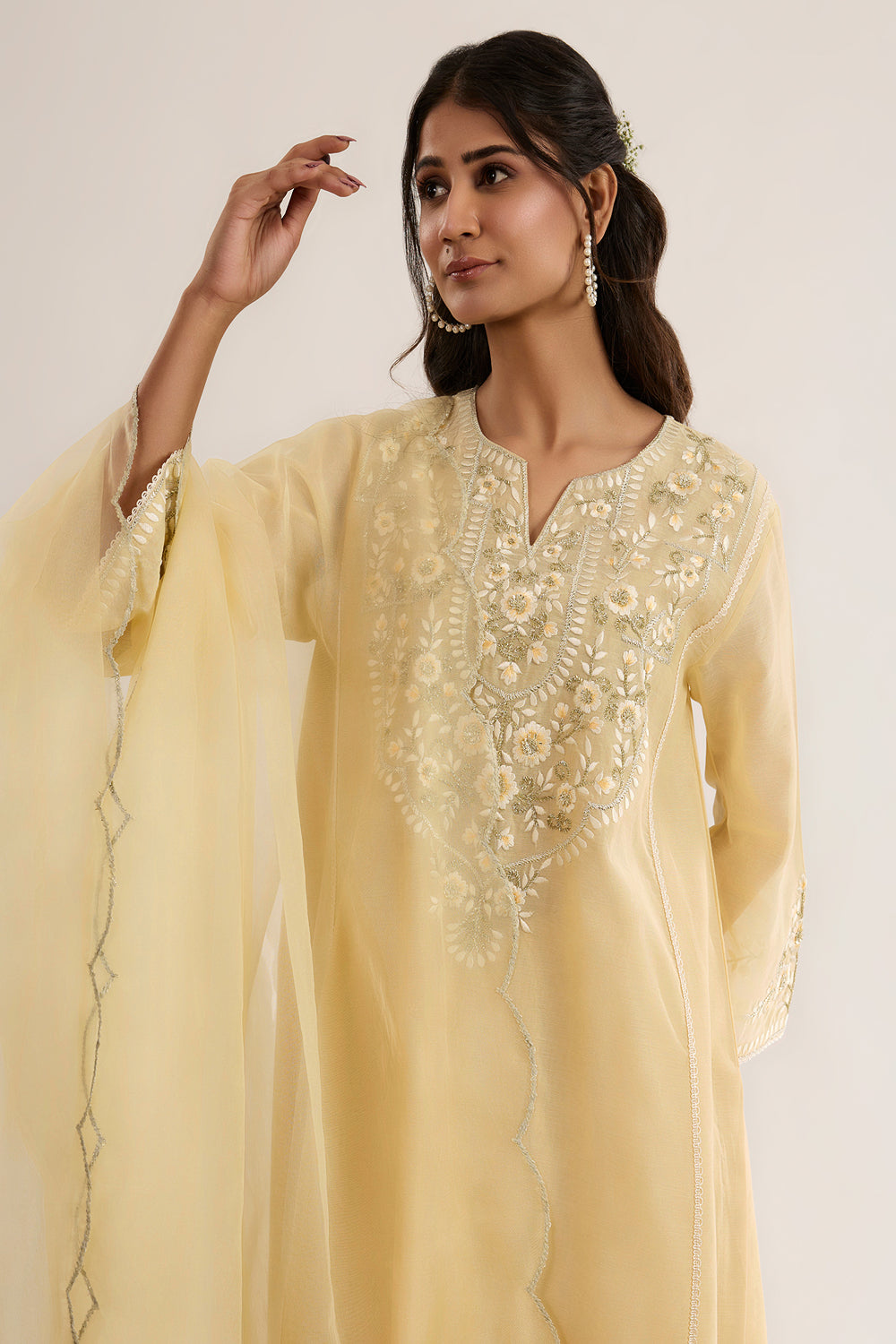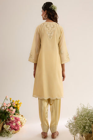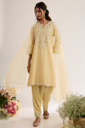 This beautiful Choga style AFIFA is made from Chanderi fabric, it is teamed with Satin salwar and sheer embroidered oragnza dupatta. This outfit features a classic neck design and has three quater sleeves