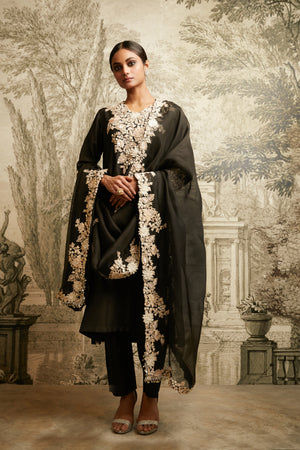 Resham and lampi work on silk long kurta with organza dupatta and cotton Satan pant