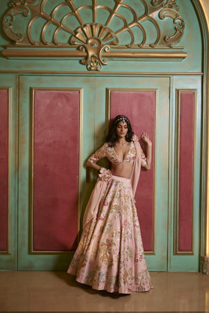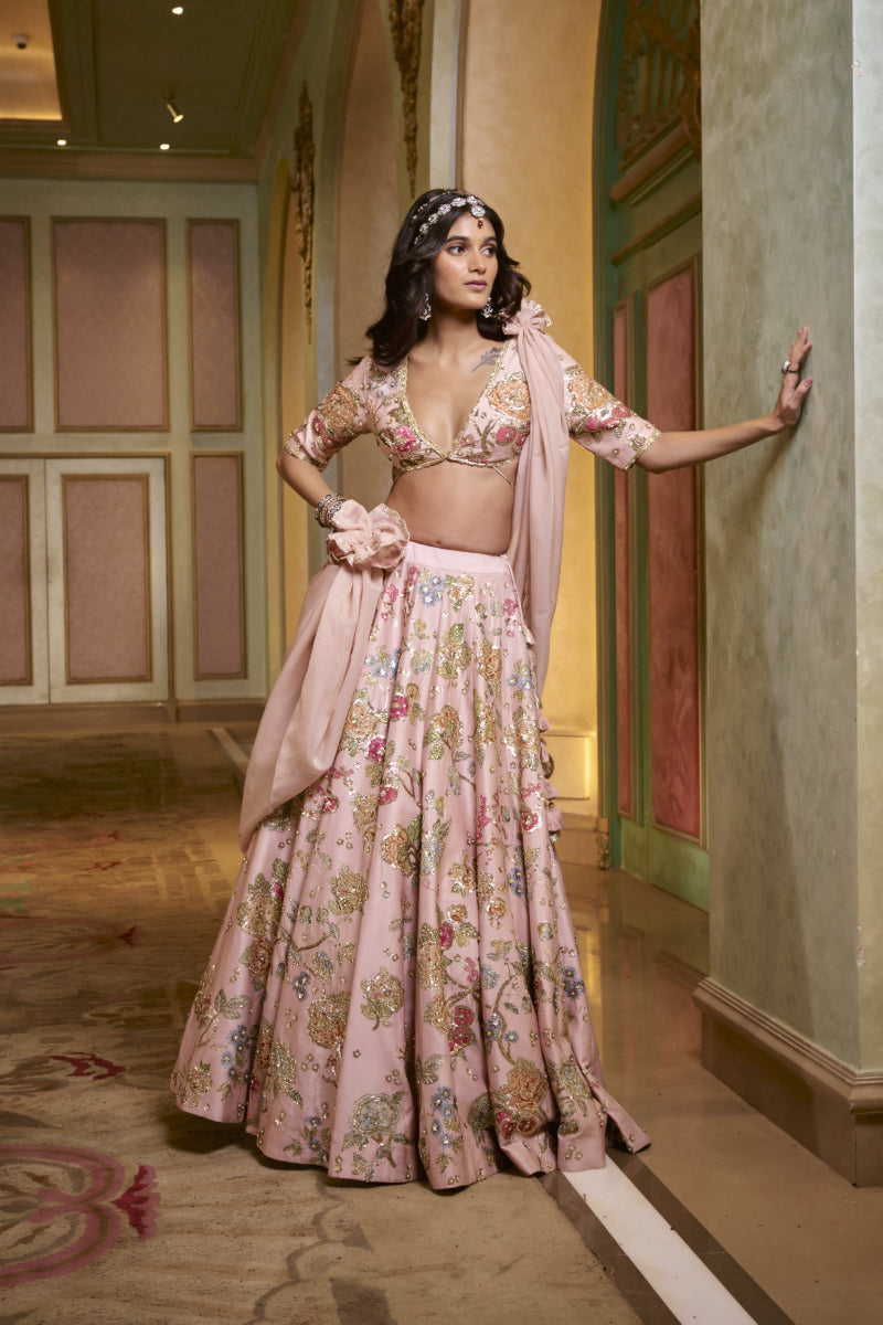 Our baby pink lehenga set adorned with multicolored floral embroidery in intricate aari and embellishment work. It is paired with a deep V-neck blouse, blending softness with vibrance. It is adorned with a lightweight organza dupatta, finished in a delicate scallop design.