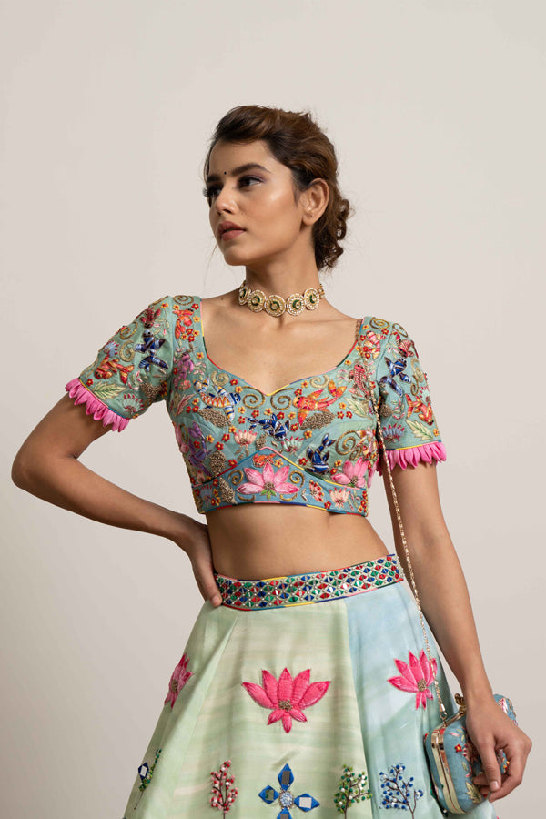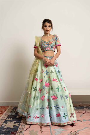 Lotus Pond Hand Embroidered, Mirror Work, Zardosi Work Lehenga with Purely Hand Embroidered Blouse and Hand Embroidered Dupatta