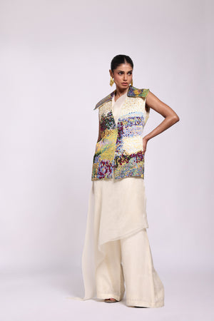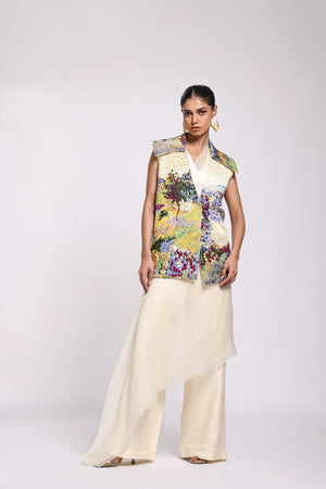 Printed Jacket With Hand Embroidery + Silk Inner With Drape And Silk Pants