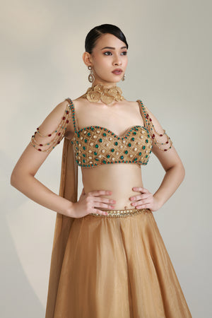 – Blouse: Noodle strap with emerald stone embroidery & beaded shoulder tassels