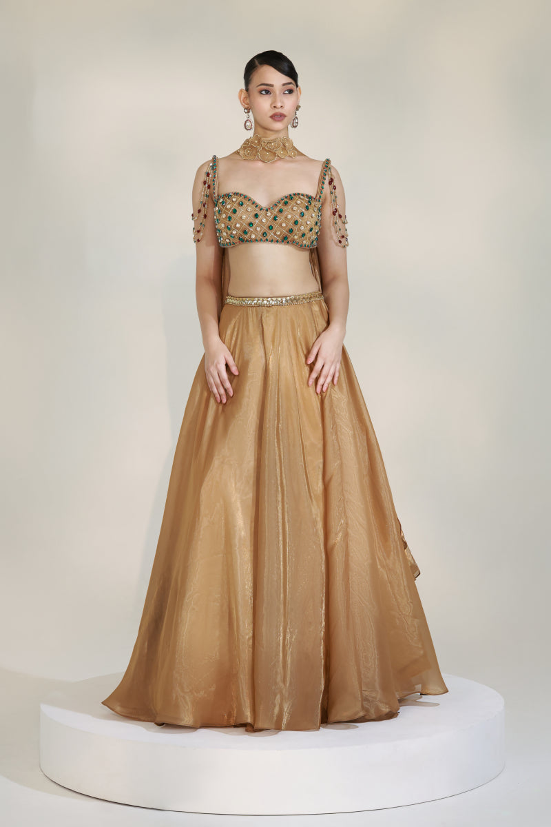 A striking blend of modern glamour and artisanal craft. This set features a plain skirt with an embroidered belt, styled with a noodle-strap blouse embellished with emerald stone embroidery and delicate bead hangings cascading from the shoulders. The applique-embroidered dupatta neckline adds a jewel-like grace, tying the look together with contemporary elegance.