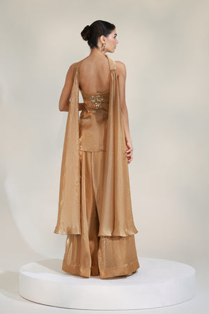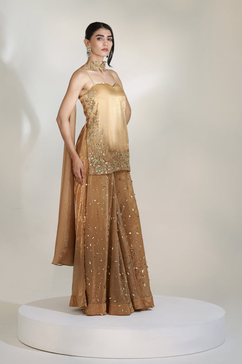 A modern festive statement with a timeless soul. This organza kurti is exquisitely hand-embroidered with zari and 3D sequins, paired with a beautifully coordinated sharara featuring the same intricate work. The dupatta is elevated with an applique-embroidered neckline design, draping like an ornament for an effortlessly regal finish.