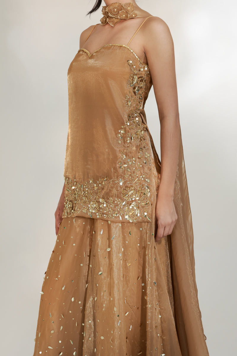 – Kurti: Organza with hand embroidery in zari & 3D sequins