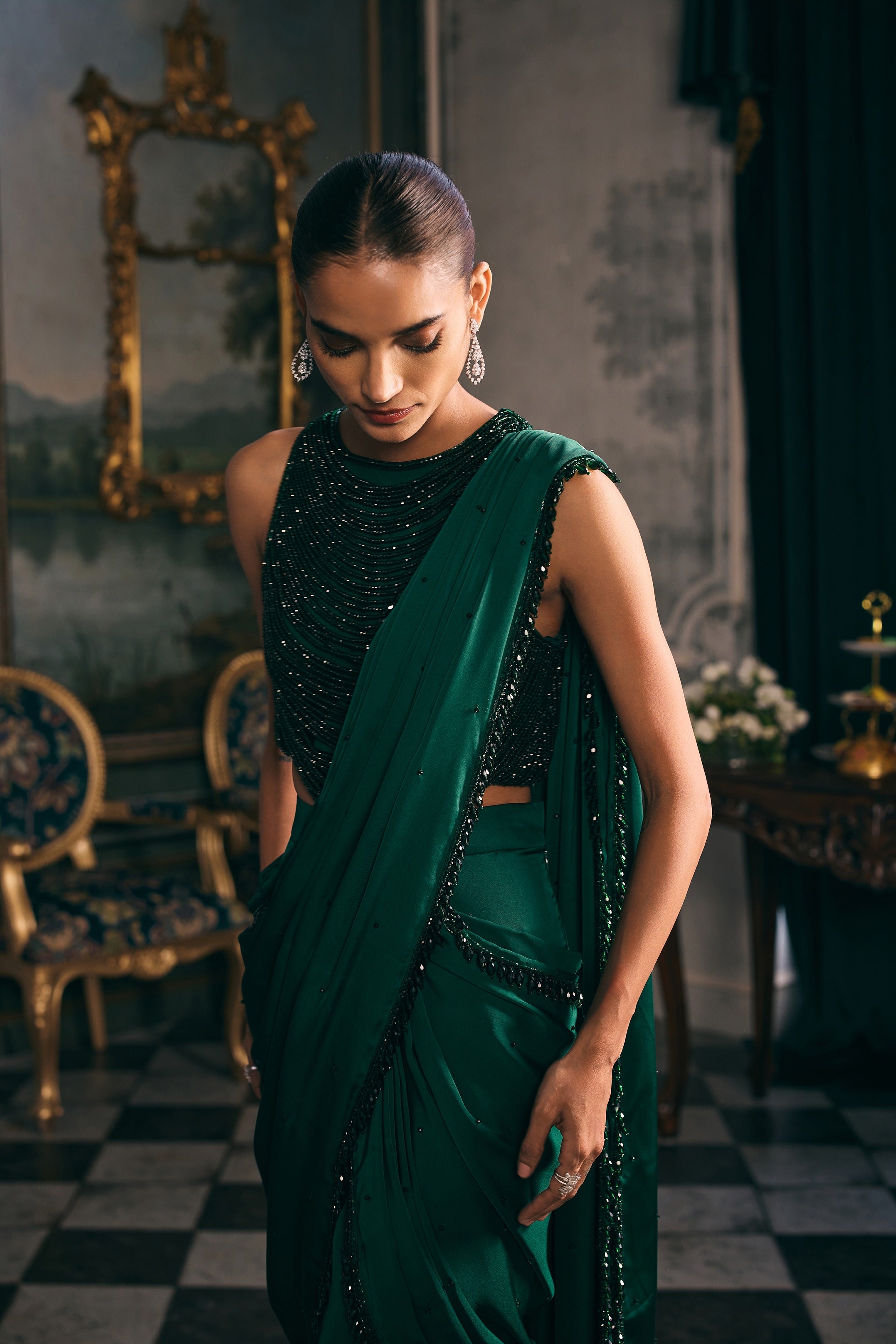 Command attention in this emerald green tassel saree with mermaid-style skirt, a striking blend of modern design and timeless elegance. Crafted in a sculpted silhouette, the skirt hugs the body gracefully, flaring into a dramatic finish that highlights feminine curves with poise. The attached drape, seamlessly designed for ease of wear, flows effortlessly and is accentuated with delicate tassel edge details that sway with movement, adding a touch of playful sophistication. This contemporary saree redefines festive and wedding wear, merging the fluidity of a classic drape with the boldness of couture construction. The tassel embellishments lend texture and charm, while the jewel-toned green makes it an opulent choice for evening galas, cocktail receptions, and celebratory gatherings. Ideal for the modern woman who desires effortless glamour with a distinctive edge, this saree requires minimal styling—simply pair with statement earrings and sleek heels to complete the look. Designed to captivate, it is a celebration of artistry and allure.