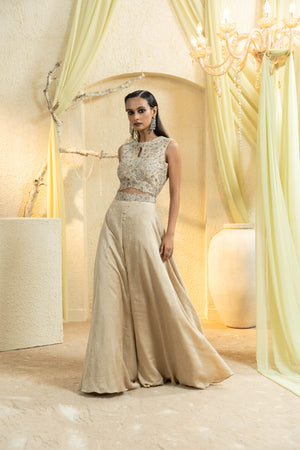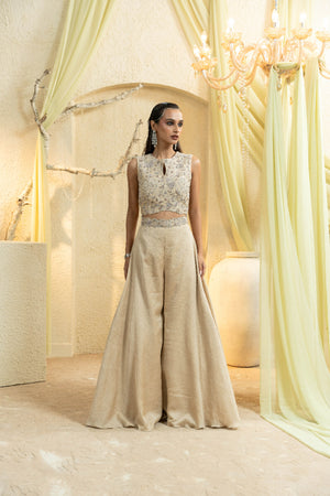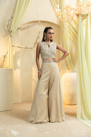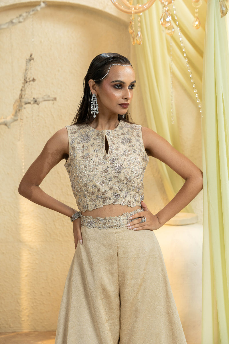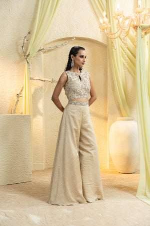 The Luxe Beige Hand-Embroidered Jumpsuit is a statement in contemporary elegance, featuring intricate embroidery on the bodice and a fluid wide-leg silhouette. Its refined design blends sophistication with ease, making it a perfect choice for both day celebrations and evening soirées.
