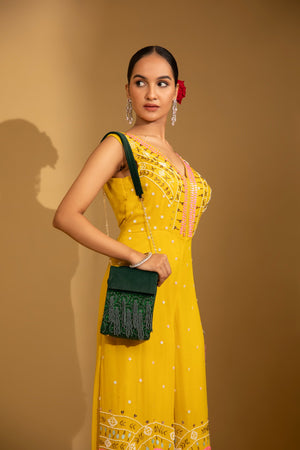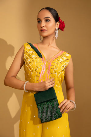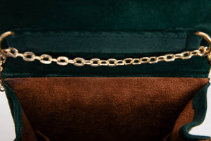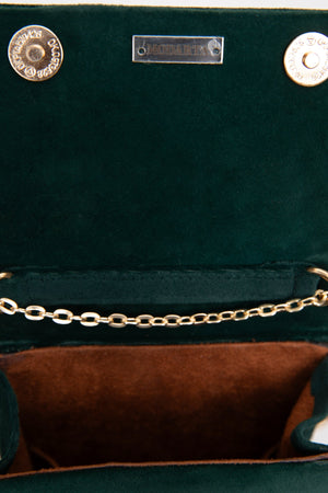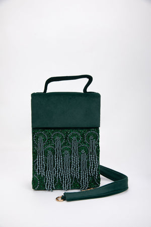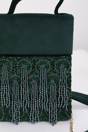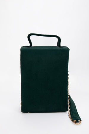 Discover luxury in our emerald green box clutch, crafted from suede and semi-velvet with exquisite crystal beadwork. Complete with suede lining and a detachable sling strap, it exudes timeless elegance and royal charm.