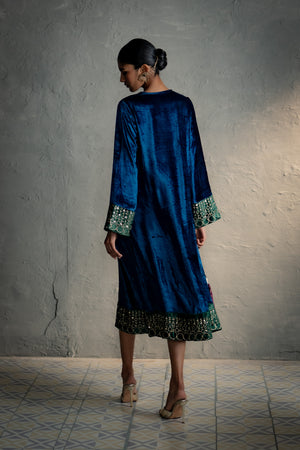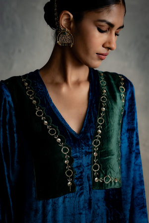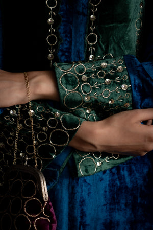 A mid-length velvet dress designed for modern elegance, featuring flared long sleeves and intricately embroidered cuffs adorned with circular and floral motifs in sequins. The deep green contrasting yoke, sleeve cuffs, and bottom fold are highlighted with embroidery that adds a contemporary touch to this refined silhouette. Pair it with our contrasting velvet bag to complete the look, a perfect blend of tradition and modern sophistication.