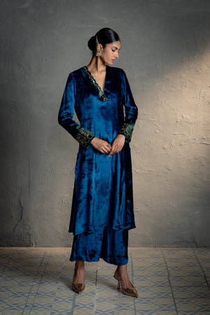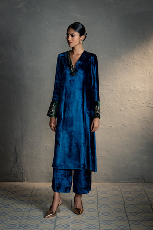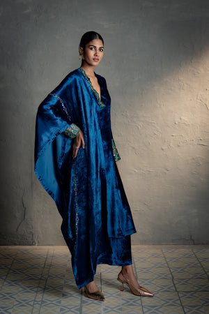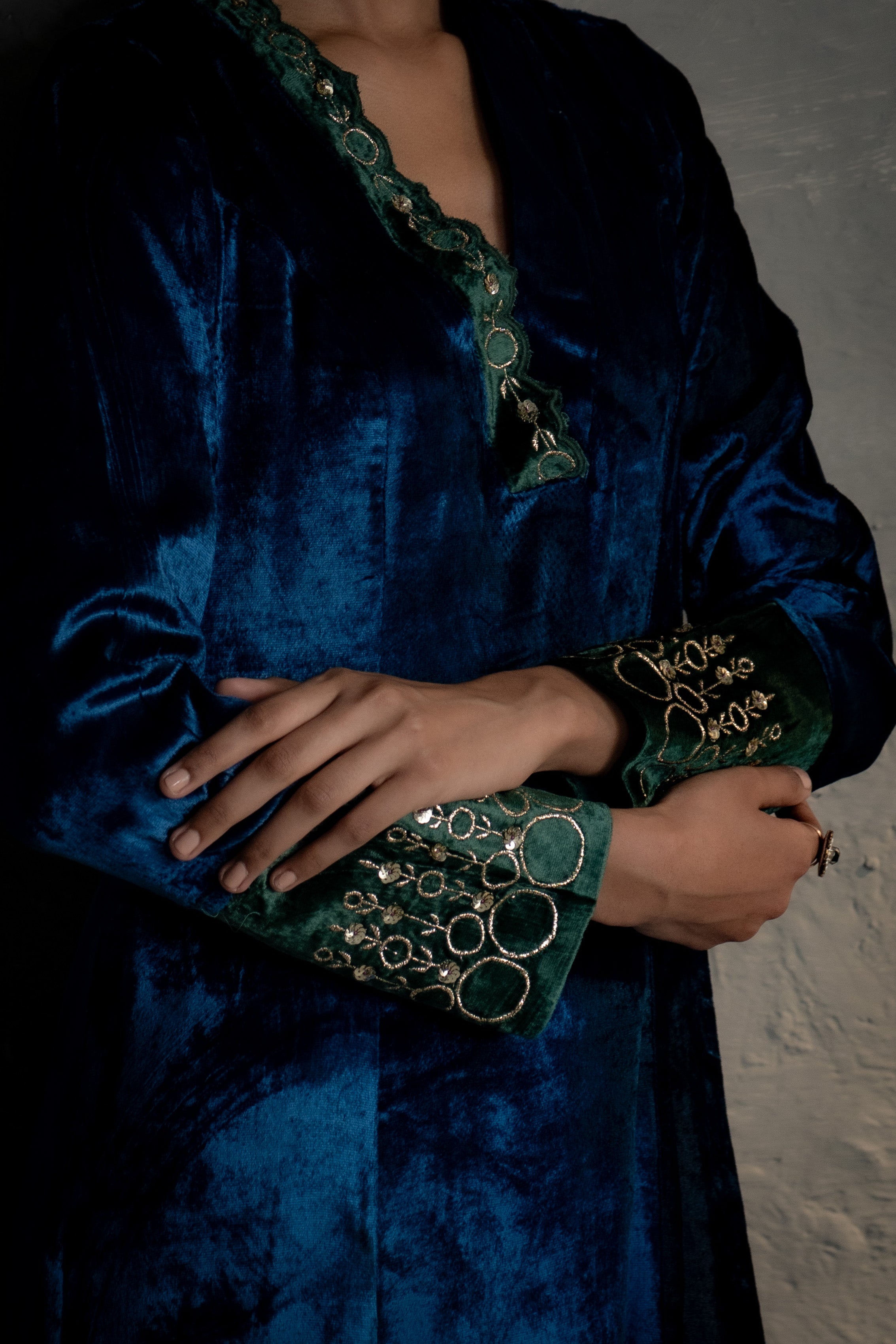 A refined velvet ensemble highlighted by circular embroidery along the scalloped neckline and contrasting sleeve cuffs. Paired with an embroidered velvet stole and straight palazzos, it captures an effortless blend of grace and elegance.