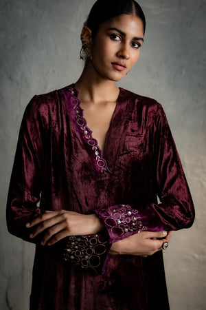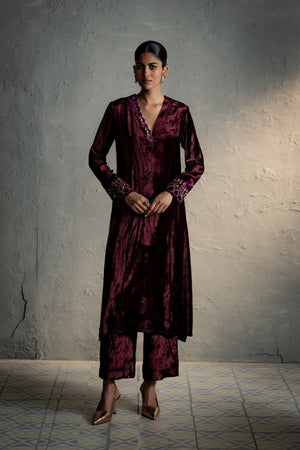 A refined velvet ensemble highlighted by circular embroidery along the scalloped neckline and contrasting sleeve cuffs. Paired with an embroidered velvet stole and straight palazzos, it captures an effortless blend of grace and elegance.