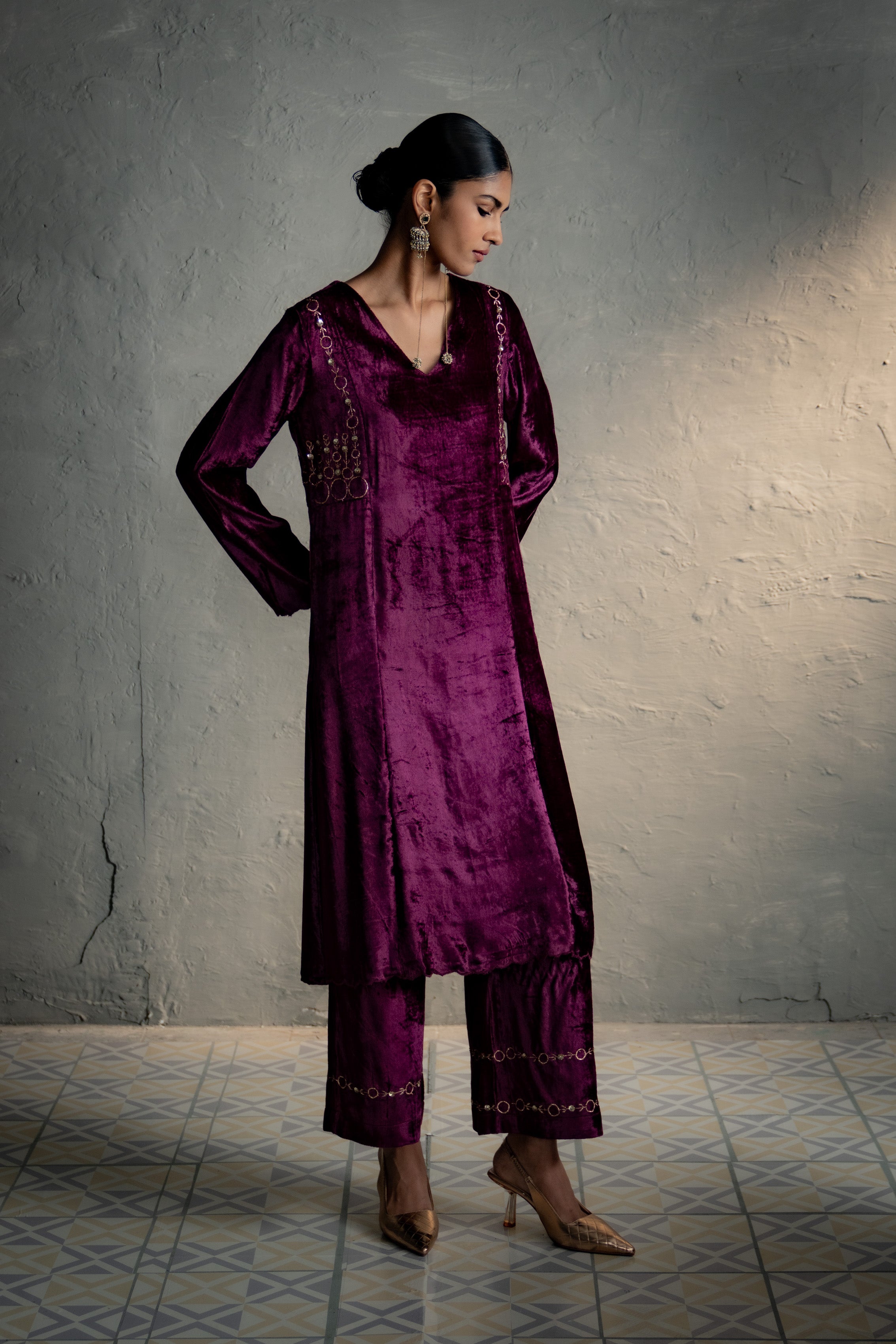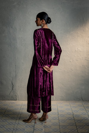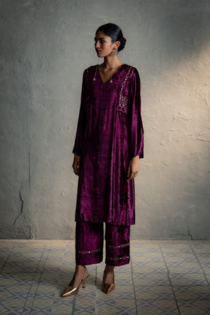 An elegant velvet suit adorned with circular embroidery along the front and back yoke, tracing the armhole in a jacket-style silhouette. It is paired with loose, embroidered palazzo pants that add graceful movement. Available in two rich colour options, one complemented by an embroidered velvet stole, and the other by an organza dupatta finished with a velvet border for a delicate flowy drape.