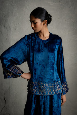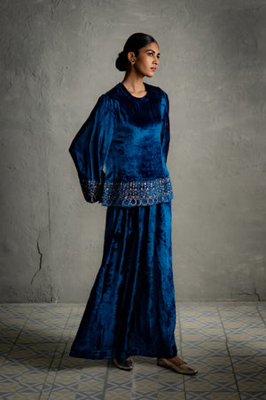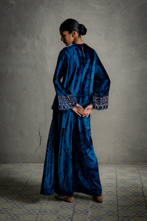 A contemporary two-piece cord set featuring a heavily embroidered top with detailed hem and sleeve cuffs, flared long sleeves, and paired with flared, ankle-length palazzos. Designed for modern formal occasions, this ensemble balances intricate craftsmanship with a sleek, contemporary silhouette.