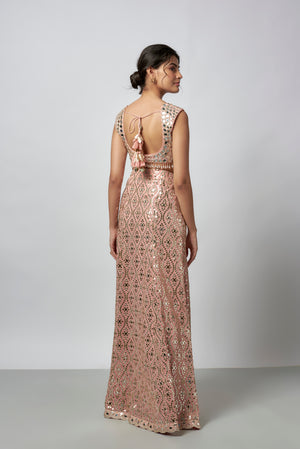 The crop top is hand embroidered with intricate mirror work and delicate embroidery, featuring a flattering square neckline and beads hanging along hem.The high-slit skirt is equally captivating, showcasing mirror work and embroidery that shimmer beautifully.