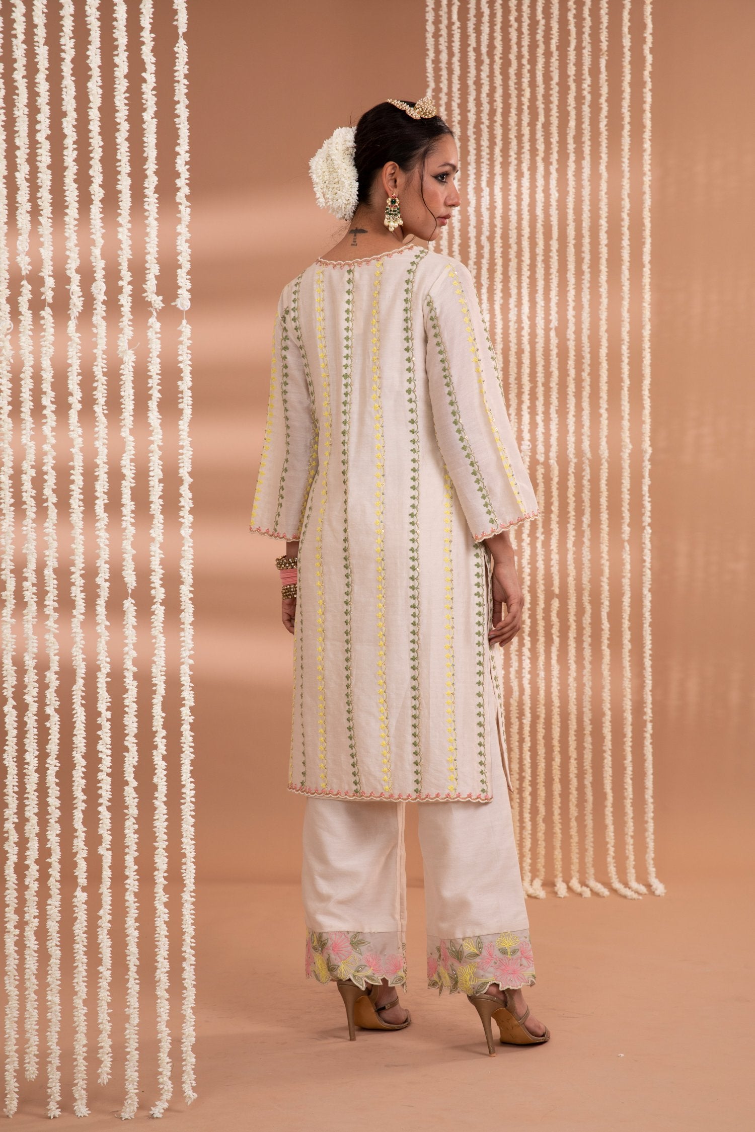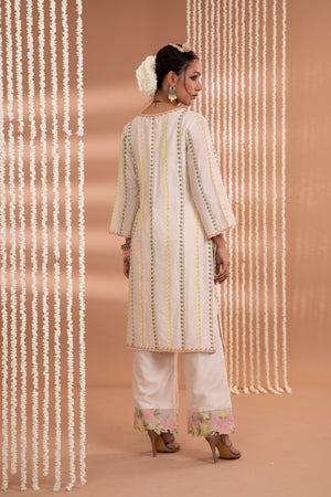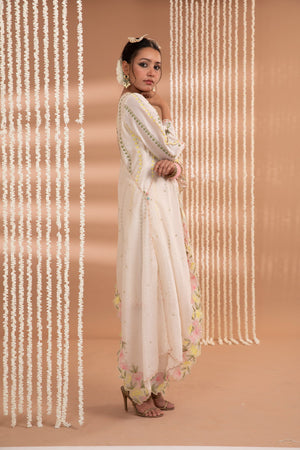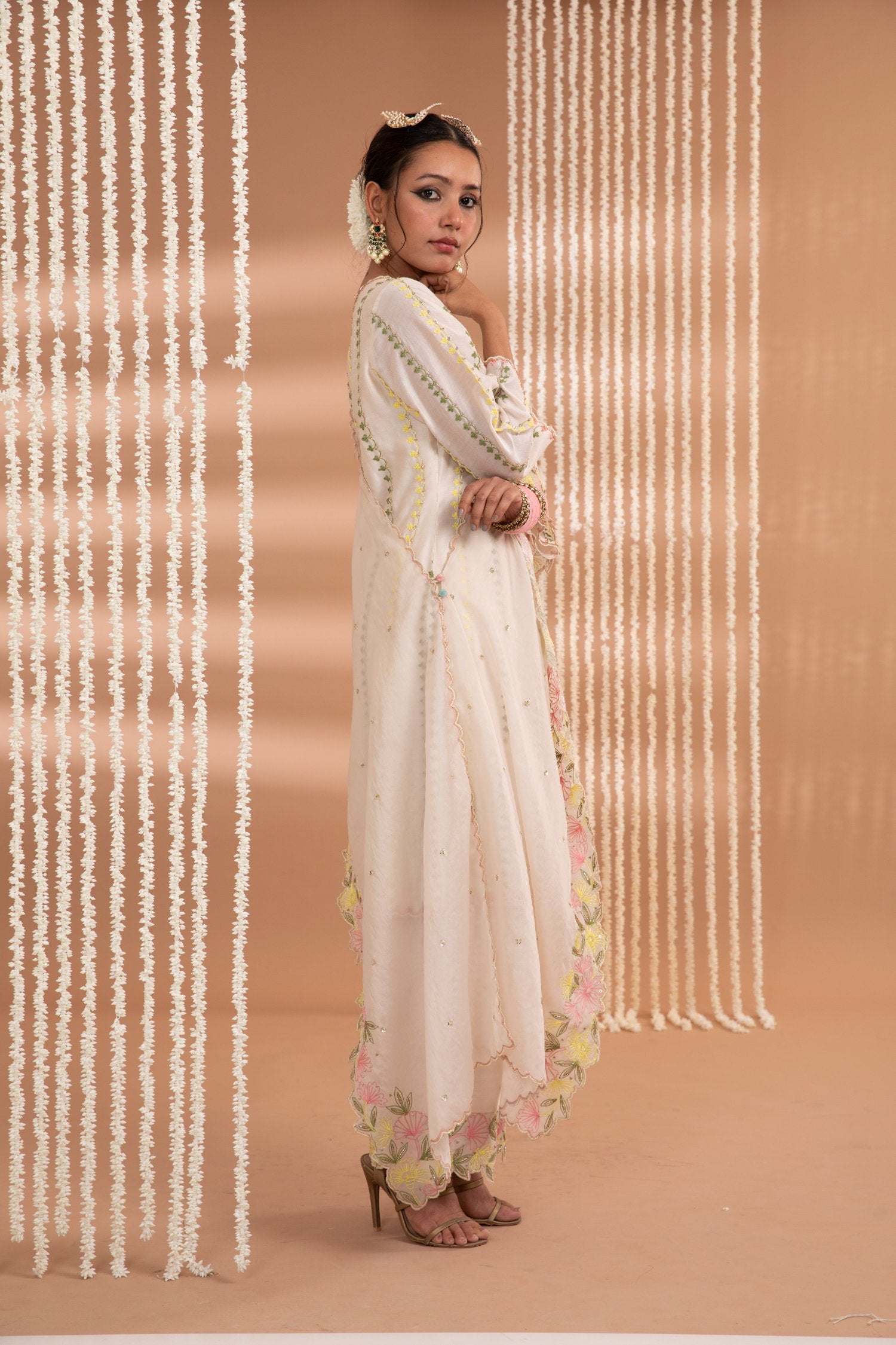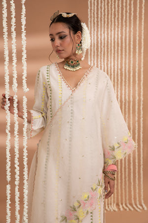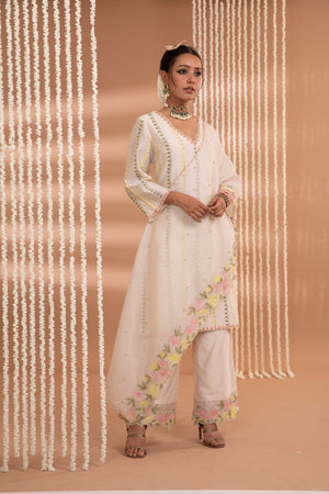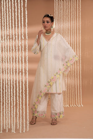 Featuring a beautiful ivory straight suit with colourful resham embroidary and hand work along with scallop finishings on sleeves and bottom. Paired with matching pants with gorgeous floral embroidary and hand work on organza patch. Bringing the whole set together is the delicate organza stole with loop buttons that can be worn as cape highlighted with floral cutwork embroidary and hanwork.